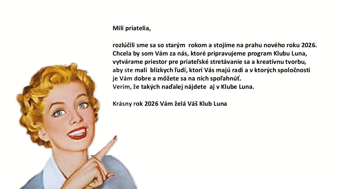 rozlúčili sme sa so starým rokom a stojíme na prahu nového roku 2026. Chcela by som Vám za nás, ktoré pripravujeme program Klubu Luna, vytvárame priestor pre priateľské stretávanie sa a kreatívnu tvorbu, aby ste mali blízkych ľudí, ktorí Vás majú radi a v ktorých spoločnosti je Vám dobre a môžete sa na nich spoľahnúť. Verím, že takých naďalej nájdete aj v Klube Luna.